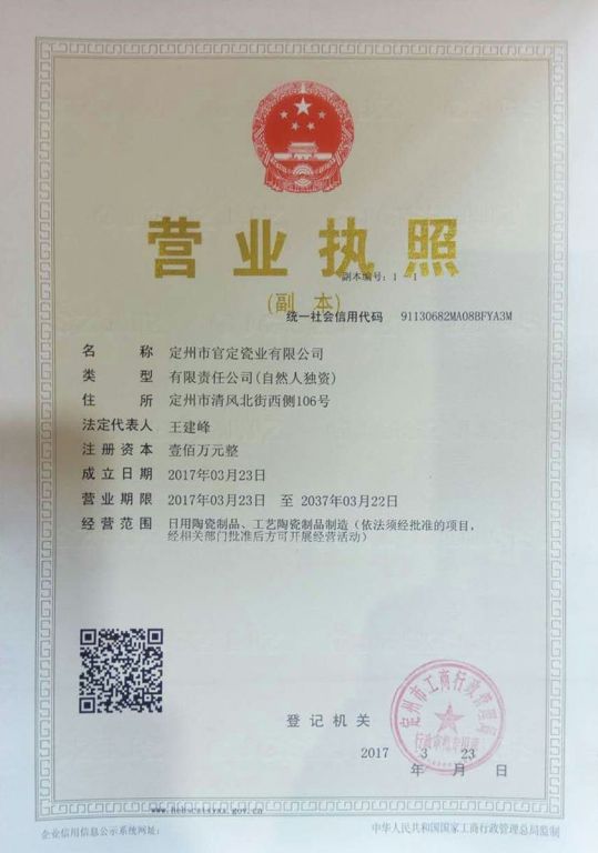 定州市官定瓷業有限公司,位于“定瓷文化發祥地”——定州,其前身是官瓷定窯文化交流中心,成立于2013年,官定瓷業是一家集定窯文化推廣,定瓷生產、科研的市級重點龍頭企業,主要經營定瓷茶具、餐具,定瓷工藝品等。